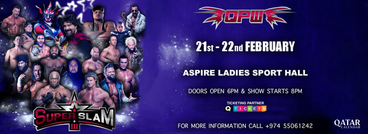 Qatar Pro Wrestling (QPW) invites you to experience SUPERSLAM III where over 30 international wrestling superstars face off in two exciting nights of action-packed matches! The Aspire Ladies Sports Hall in Qatar will become the ultimate wrestling arena on February 21 and 22, 2025.